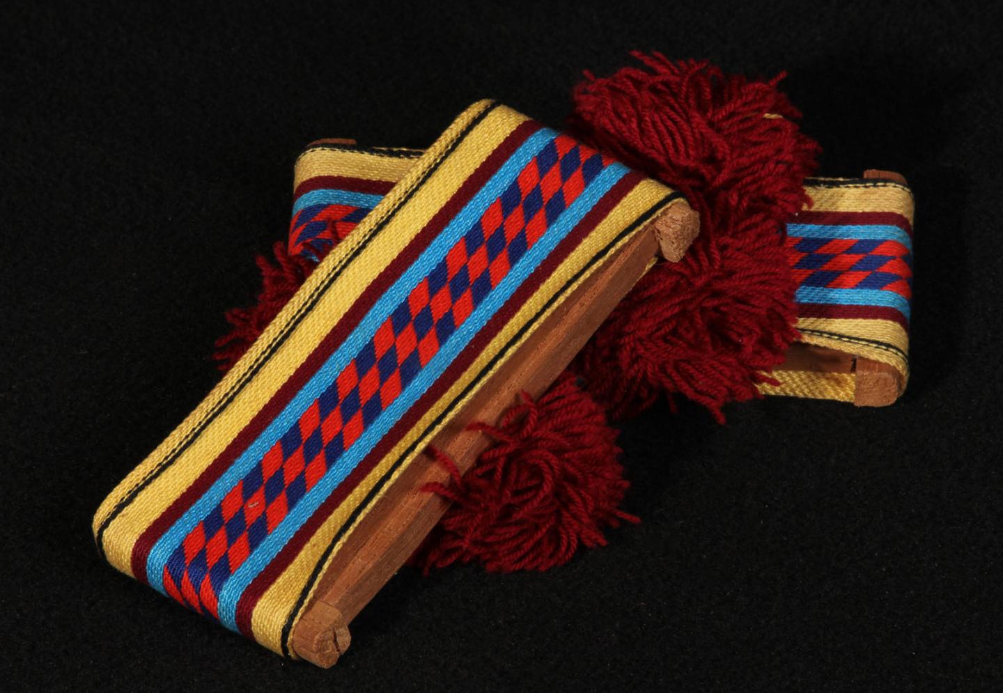 These calfbands are neither "woven" nor "embroidered." The colors are worked in as the band is crocheted (with an umbrella spoke) around a form such as a bottle. For more details on the art of calfbands, see S. and R. Price, Les Arts de Marrons (Vents d'ailleurs 2005), which illustrates calfbands and describes their construction.