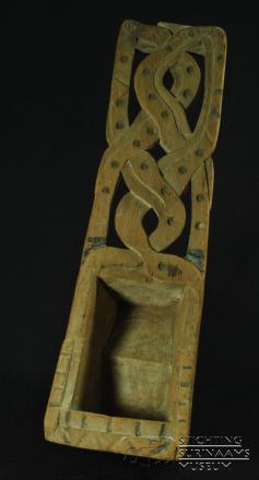 Zeepbak van wit cederhout. Het is een rechthoekige bak met aan een van de korte zijden een lang rechthoekig handvat, dat versierd is met open snijwerk en koperen kopspijkers die voor het grootste deel verdwenen zijn.