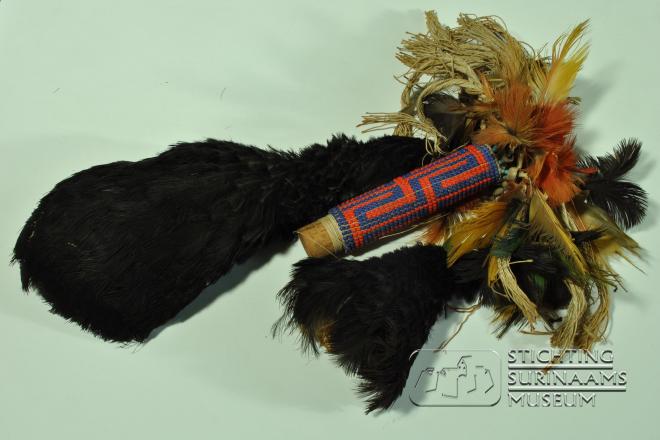 Een haarversiering van een stuk bamboe (?). Rondom zijn in een symmetrisch patroon oranje en blauwe kraaltjes gehaakt. Aan de onderzijde hangen strengetjes draad met een zaad en twee kralen eraan vastgemaakt, evenals bruine, rode en gele veren. Aan een andere draad hangt een stuk vogelhuid met zwarte veren.