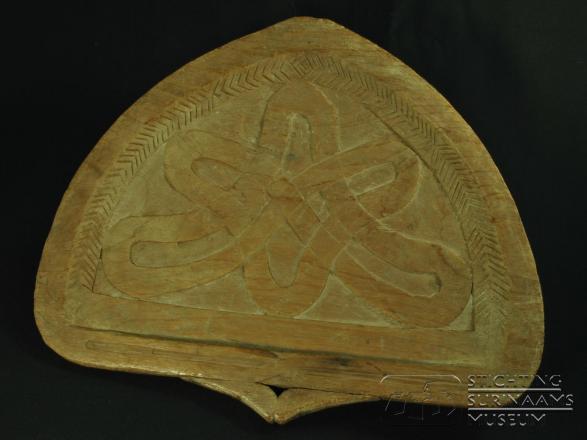 Een waaier van hout. Het heeft een rechte zijde en is voor de rest halfrond. Aan de rechte zijde is een klein handgreepje met een kleine opening in het midden. De waaier is aan één kant versierd met houtsnijwerk.