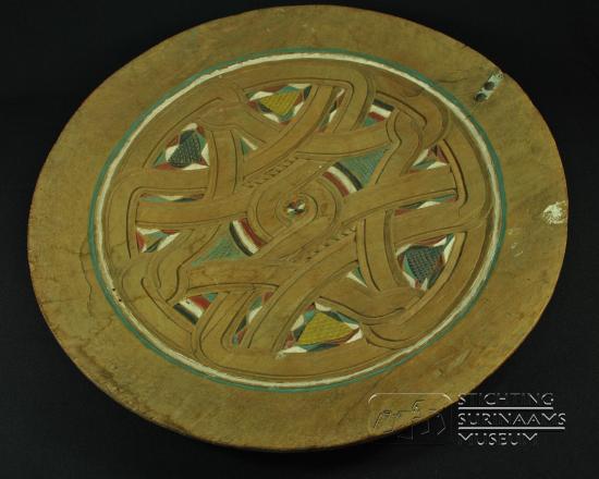 Bord van cederhout. Het bord is rond en concaaf van vorm. De rand is glad, Het centrale deel is geheel versierd met snijwerk in laag reliëf, waarbij enkele motieven beschilderd zijn. Het snijwerk is gevat in een blauw en wit geschilderde cirkel. Een scheurtje aan de rand is hersteld met een een aluminium plaatje dat met koperen kopsijkers is aangebracht. De onderzijde is met ingekraste cirkels en motieven versierd. Het bord is geschilderd in de kleuren rood, wit, donkerblauw, lichtblauw, geel en zwart. Het snijwerk symboliseert verbondenheid.