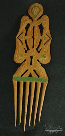 Een kam van hout bestaande uit een handvat en zes op doorsnee ronde tanden. De tanden zitten vast aan een groot symmetrisch opengewerkt handvat. De kam is versierd met houtsnijwerk en groene verf.