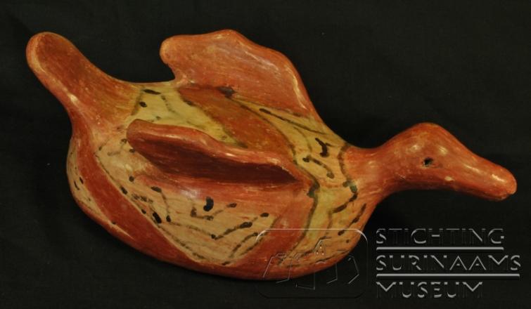 Een aardewerken duif. De onderzijde is plat. De eend is versierd met rode kleurstof en een zwart lijnpatroon.