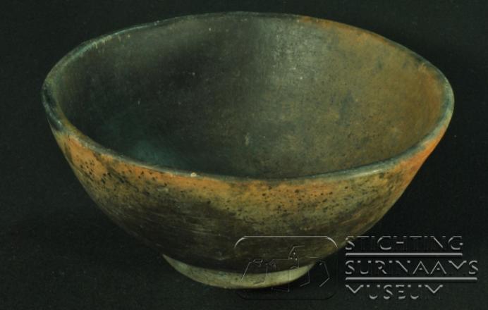 Een wijd uitlopige kom van zwart aardewerk. De kom staat op een kleine ronde voet. De kom is verder niet versierd.