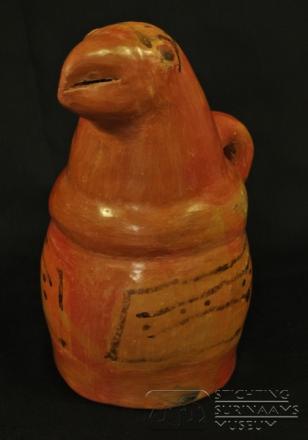 Een gestyleerde papegaai van aardewerk. De bodem is rond op doorsnede met daarop de kop van een papegaais. Aan de achterkant zit een kleine handgreep. Het beeld is versierd met rode kleurstof en een zwart lijnpatroon.