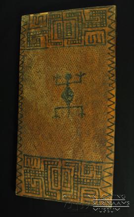 Een cassaverasp gemaakt van hout. Op 13cm van de ene en 14cm van de andere kant zijn over een lengte van 37cm steentjes geplaatst voor de raspfunctie. Op de rasp is ook versiering aangebracht. In het deel waar de steentjes zijn is een dierlijk figuur geschilderd.