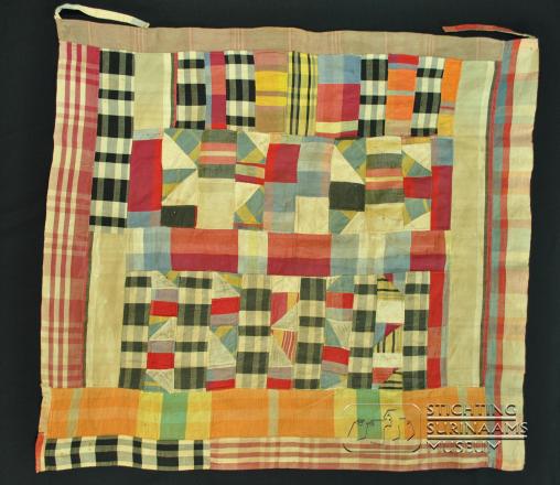 Een rechthoekige schouderdoek van geweven katoen. Het bestaat uit verschillende aan elkaar genaaide lapjes met verschillende motieven. Aan de bovenkant zijn twee touwtjes om te binden. In de kleuren zwart, rood, blauw, oranje, groen, paars en wit.