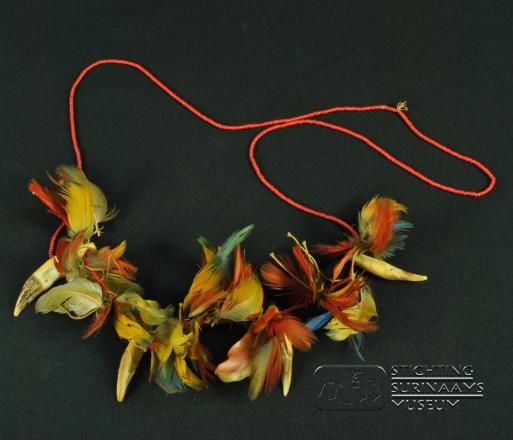 Een lange keting met een basis van rijgdraad. Aan de draad is een lang snoer van rode kralen waartussen veren en nagels geregen zijn. De veren zijn blauw/rood/geel van kleur.